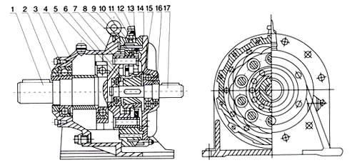 1.輸入軸2.擺線輪3.轉(zhuǎn)臂4.輸出軸5.針齒殼