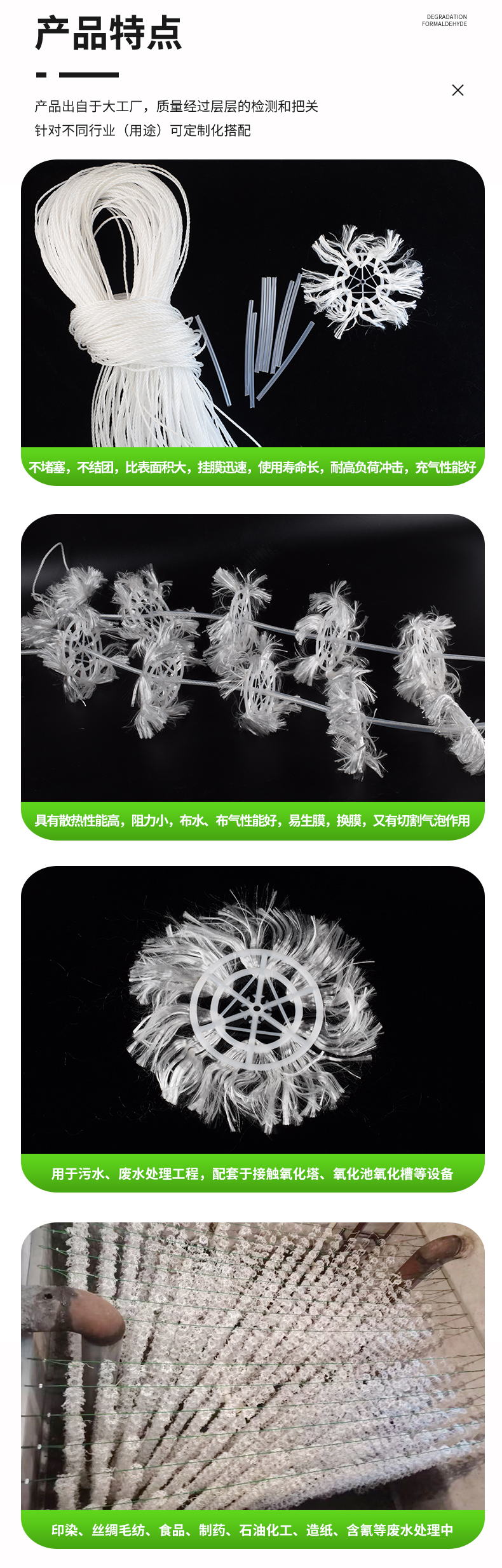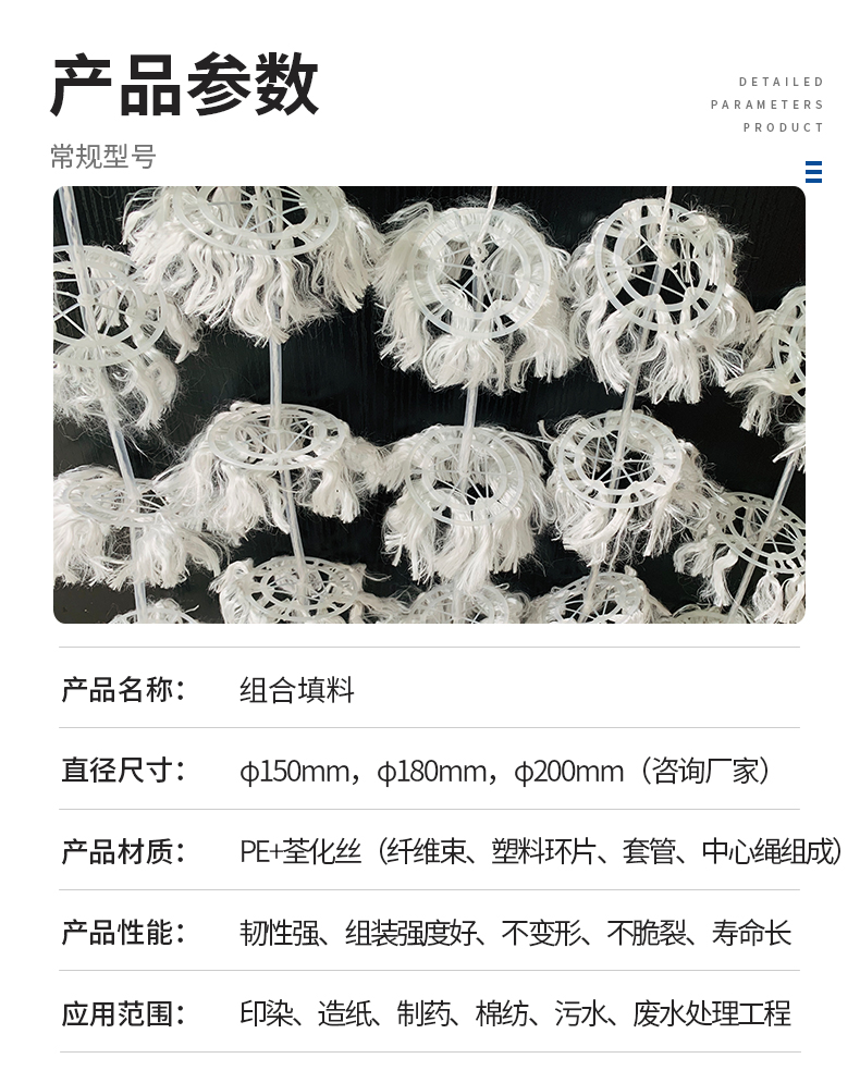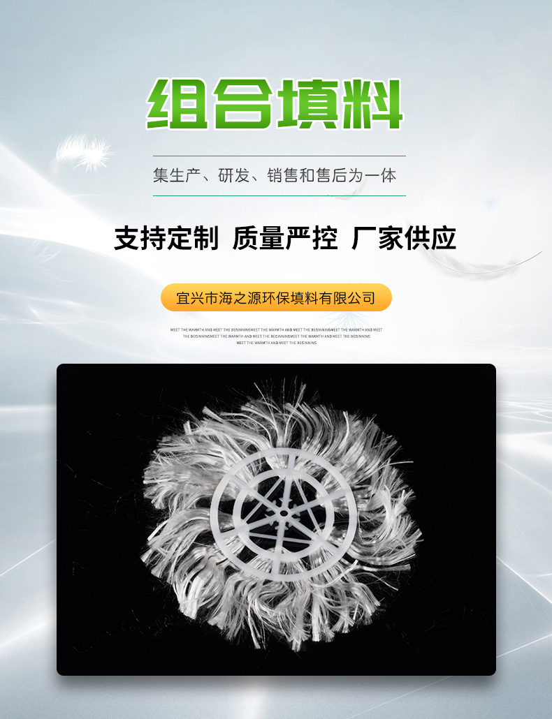 組合填料是在軟性填料和半軟性填料的基礎上發展而成的,它兼有兩者的優點。其結構是將塑料圓片壓扣改成雙圈大塑料環,將醛化纖維或滌綸絲壓在環的環圈上,使纖維束均勻分布;內圈是雪花狀塑料枝條,既能掛膜,又能有效切割氣泡,提高氧的轉移速率和利用率。使水氣生物膜得到充分交換,使水中的有機物得到高效處理。
